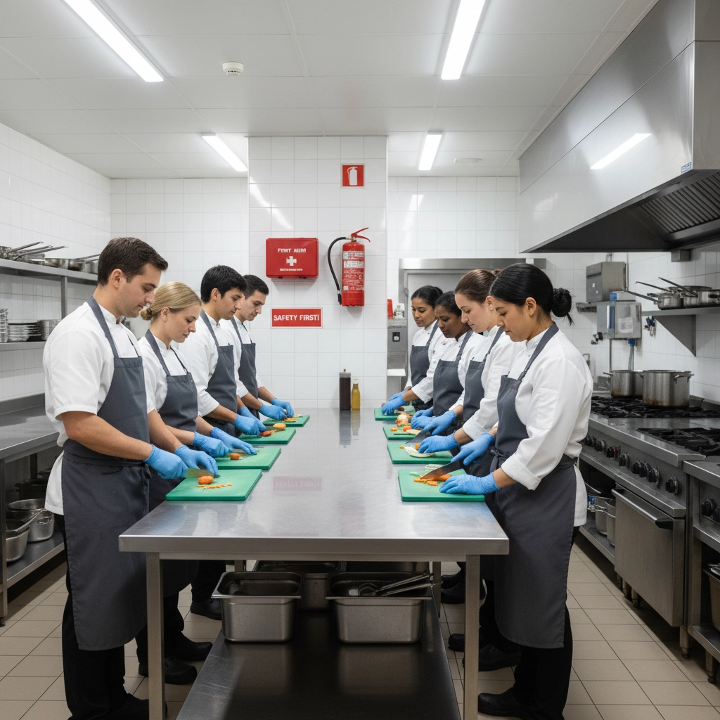 Develop comprehensive safety training programs for all employees. Cover proper knife handling techniques, chemical storage procedures, and lifting protocols. Document all safety training completion and maintain training records.