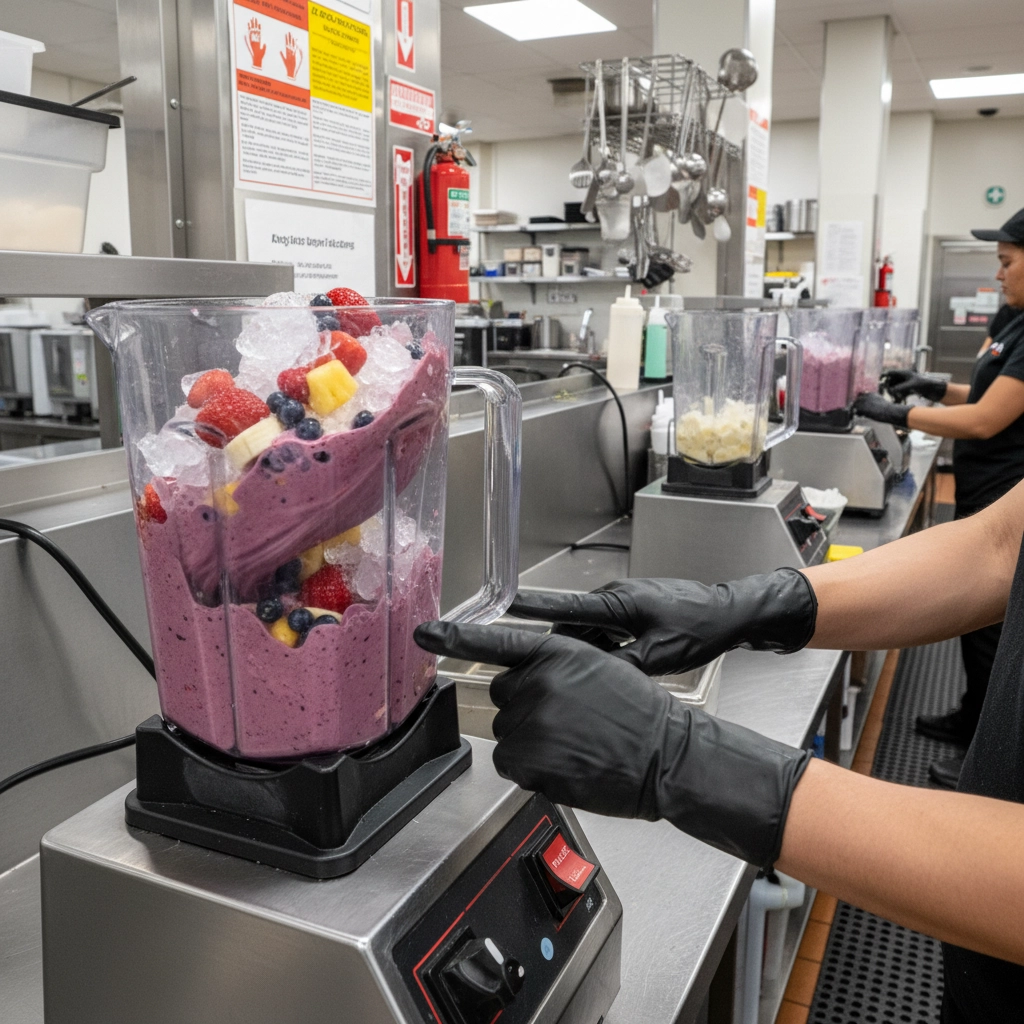 Sharp blender blades present cutting risks during cleaning and maintenance procedures. Heavy lifting requirements for ingredient deliveries and equipment movement create strain and injury potential. Wet floors from frequent cleaning and beverage preparation increase slip hazards for staff members.