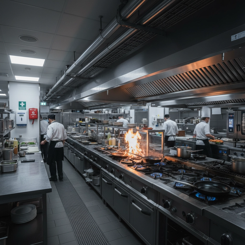 Install UL 300-compliant fire suppression systems in commercial kitchens. These systems automatically activate during grease fires and other cooking-related incidents. Ensure regular maintenance and inspections meet manufacturer specifications.
